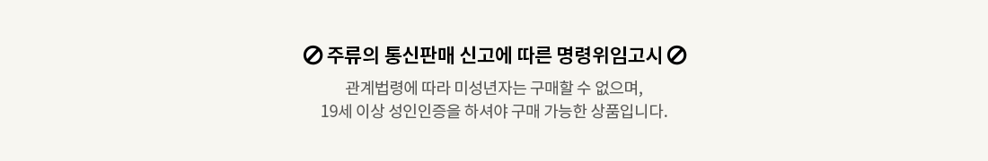 🚫주류의 통신판매 신고에 따른 명령위임고시🚫 관계법령에 따라 미성년자는 구매할 수 없으며, 19세 이상 성인인증을 하셔야 구매 가능한 상품입니다. |